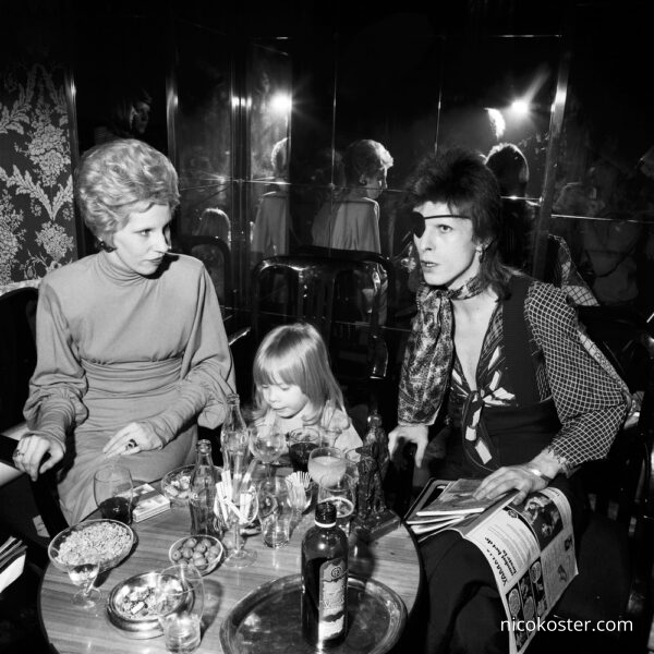 Nico Koster is known for his award-winning news-photos and the many portraits he made of international and Dutch visual artists. He also had pop musicians in front of his camera, which has led to several well-known iconic photographs. For example, Nico photographed David Bowie when Bowie visited the Netherlands in 1974 for a performance in the Toppop studio. He came to perform the song ‘Rebel Rebel’, and was joined by his wife Angie and son Zowie. Nico photographed the rock star at a very casual moment as David was waiting in the Amstel Hotel for the Edisons that evening (he also received one). After the event Nico was the only one allowed to accompany Bowie and his family to his suite, where Nico shot some beautiful portraits of the singer.